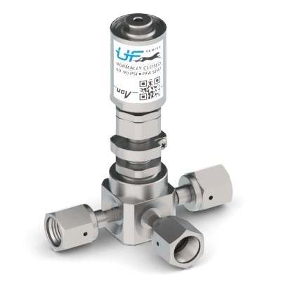 Item # UF354VFLCGF4F , UF Series - Ultra Fast, Actuated 3 Port UCV, Extended Bonnet with Fin, swivel Female Face Seal, 1/4”
