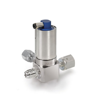 Item # HM304VKLCGM4GF4GF4 , HM Series, Low Pressure UHP Actuated 3 Port Valve, Swivel Male 1/4” x Swivel Female 1/4” x Swivel Female 1/4”