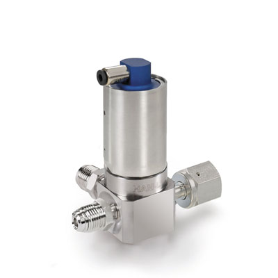 Item # HM304VKLCGM4GM4GF4 , HM Series, Low Pressure UHP Actuated 3 Port Valve, Swivel Male 1/4” x Swivel Male 1/4” x Swivel Female 1/4”