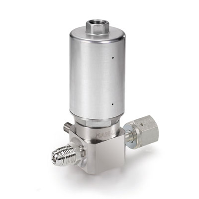 Item # HM324VKCGM4BW4GF4 , HM Series, Low Pressure UHP Actuated 3 Port Valve, Swivel Male 1/4” x Short Buttweld 1/4” x Swivel Female 1/4”