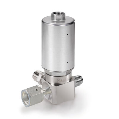Item # HM334VKCGM4GF4GM4 , HM Series, Low Pressure UHP Actuated 3 Port Valve, Swivel Male 1/4” x Swivel Female 1/4” x Swivel Male 1/4”