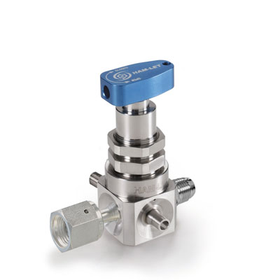 Item # HM404VKLQGF4BW4GM4BW4 , HM Series, Low Pressure UHP Manual 4 Port Valve, Swivel Female 1/4” x Short Buttweld 1/4” x Swivel Male 1/4” x Short Buttweld 1/4”
