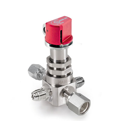 Item # HM434VKLQGM4GF4GM4GF4ISLT , HM Series, Low Pressure UHP Manual 4 Port Valve, Swivel Male 1/4” x Swivel Female 1/4” x Swivel Male 1/4” x Swivel Female 1/4”