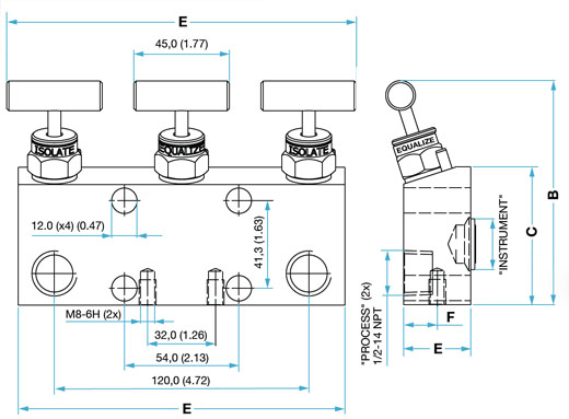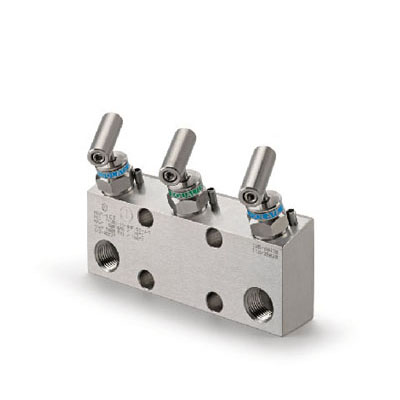 M30I156NFSSTT, SS 316L Direct Mount 3 Way Manifold, 3/8” Female NPT Thread to Flange