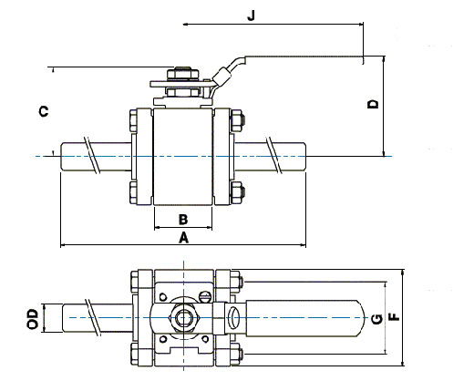 H580SSXTBW25MM, H500 Series, 3 Piece SS Ball Valve, 25mm Extanded Tube Butt Weld x 25mm Extanded Tube Butt Weld