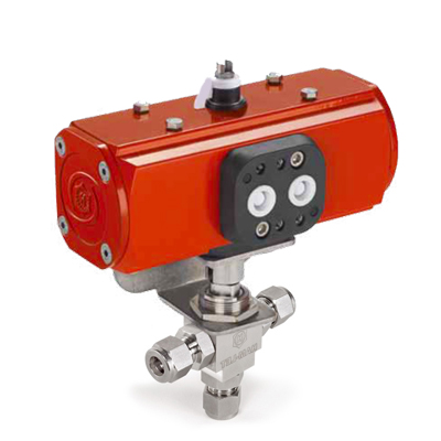 H6800SSL12MMPTA2T, H6800 Series, 3 Piece 3 Port Pattern SS Ball Valve, 12mm Let-Lok® Tube Fitting x 12mm Let-Lok® Tube Fitting, Double Acting Actuator
