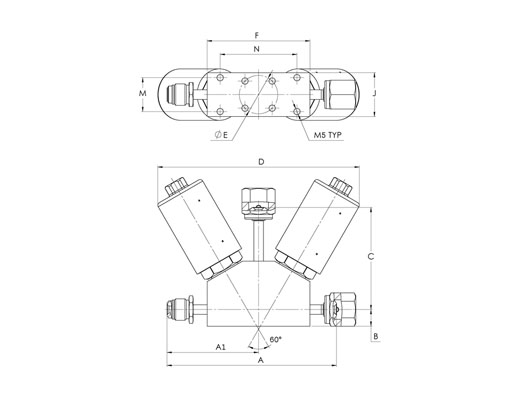 HMB Series, Multi-Port Monoblock Actuated Valve ,Swivel Male 1/4” x Swivel Female 1/4” x Swivel Female 1/4”