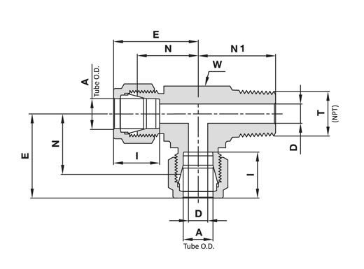 771HLB1/4X1/4, Brass Male Run Tee, One-Lok® Tube Fitting 1/4” x Male NPT 1/4” x One-Lok® Tube Fitting 1/4”