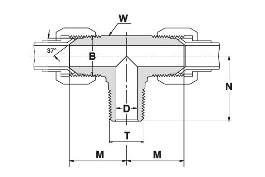 Stainless Steel 316 Tee, 37º Flare 7/8” x 37º Flare 7/8” x Male NPT Thread 3/4”