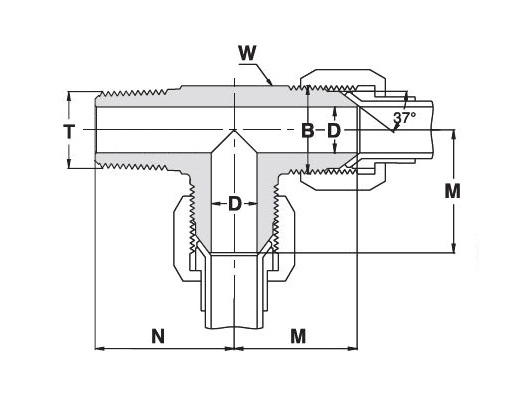 751HFSS1/2X1/2X, Stainless Steel 316 Tee, 37º Flare 1/2” x Male NPT Thread 1/2” x 37º Flare 1/2”
