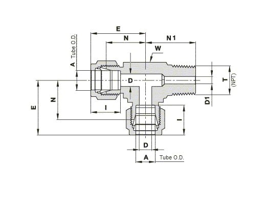 St. St. 316 Male Run Tee, Let-Lok® Tube Fitting 8mm x Male NPT 1/8” x Let-Lok® Tube Fitting 8mm