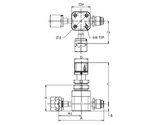 HM Series, Low Pressure UHP Manual 3 Port Valve, Swivel Female 1/4” x Swivel Female 1/4” x Swivel Male 1/4”