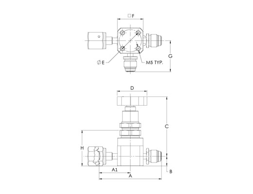 HM Series, Low Pressure UHP Manual 3 Port Valve, Swivel Female 1/4” x Swivel Male 1/4” x Swivel Male 1/4”