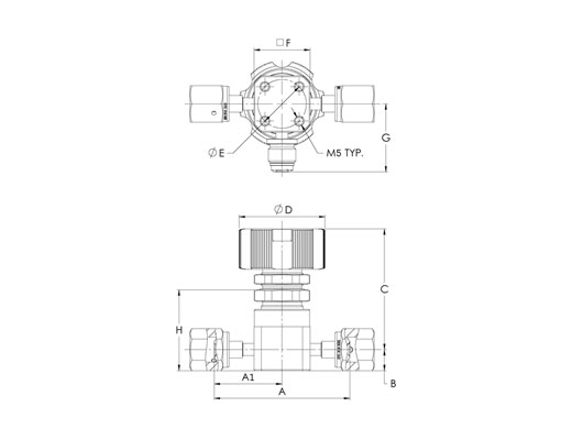 HM304VKLRGF4GM4GF4, HM Series, Low Pressure UHP Manual 3 Port Valve, Swivel Female 1/4” x Swivel Male 1/4” x Swivel Female 1/4”