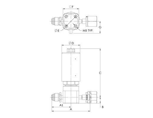 HM Series, Low Pressure UHP Actuated 3 Port Valve, Short Buttweld 1/4” x Swivel Female 1/4” x Swivel Male 1/4”