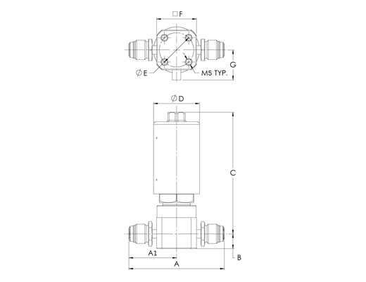HM Series, Low Pressure UHP Actuated 3 Port Valve, Short Buttweld 1/4” x Swivel Male 1/4” x Swivel Male 1/4”
