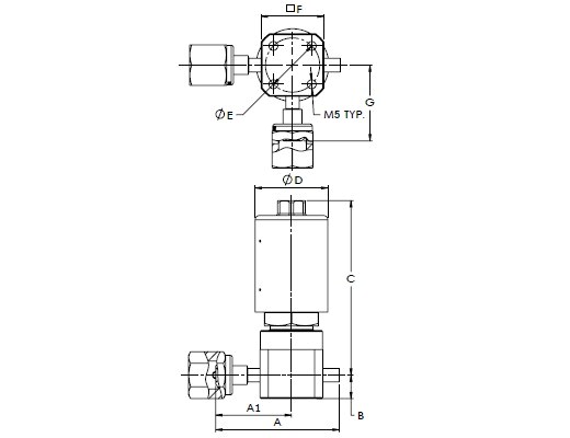 HM314VKCGF4BW4GF4, HM Series, Low Pressure UHP Actuated 3 Port Valve, Swivel Female 1/4” x Short Buttweld 1/4” x Swivel Female 1/4”