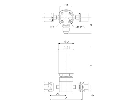 HM314VKCGM4GF4GF4, HM Series, Low Pressure UHP Actuated 3 Port Valve, Swivel Male 1/4” x Swivel Female 1/4” x Swivel Female 1/4”