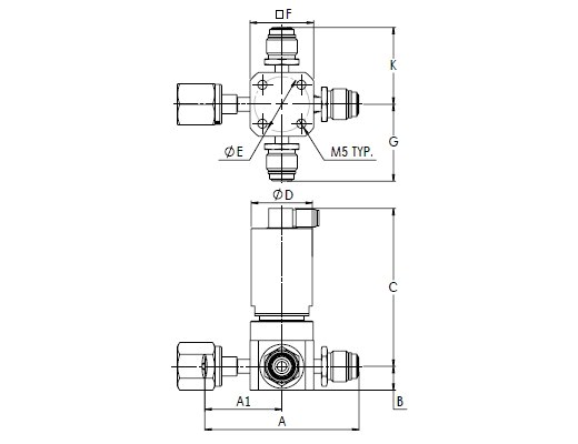 HM404VKLCGF4GM4GM4GM4, HM Series, Low Pressure UHP Actuated 4 Port Valve, Swivel Female 1/4” x Swivel Male 1/4” x Swivel Male 1/4” x Swivel Male 1/4”