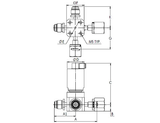 HM Series, Low Pressure UHP Actuated 4 Port Valve, Swivel Male 1/4” x Swivel Female 1/4” x Swivel Female 1/4” x Swivel Male 1/4”