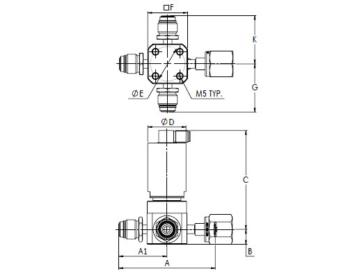 HM404VKLCGM4GM4GF4GM4, HM Series, Low Pressure UHP Actuated 4 Port Valve, Swivel Male 1/4” x Swivel Male 1/4” x Swivel Female 1/4” x Swivel Male 1/4”