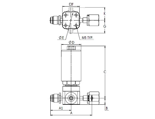 HM Series, Low Pressure UHP Actuated 4 Port Valve, Swivel Male 1/4” x Short Buttweld 1/4” x Swivel Female 1/4” x Short Buttweld 1/4”
