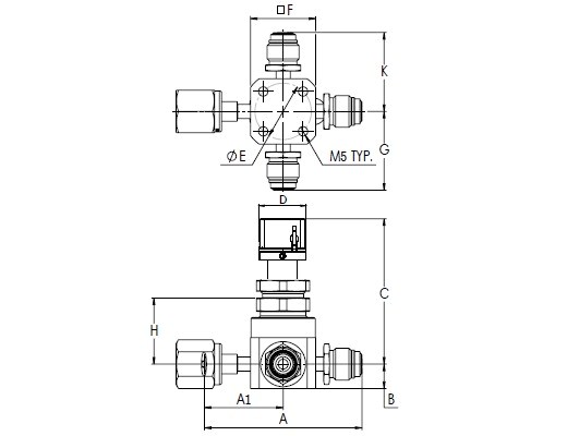 HM Series, Low Pressure UHP Manual 4 Port Valve, Swivel Female 1/4” x Swivel Male 1/4” x Swivel Male 1/4” x Swivel Male 1/4”