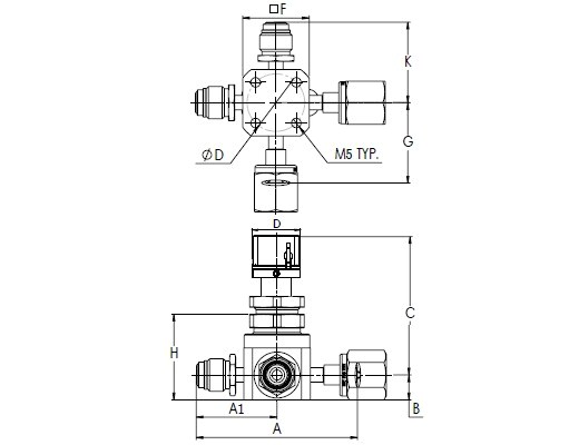 HM Series, Low Pressure UHP Manual 4 Port Valve, Swivel Male 1/4” x Swivel Female 1/4” x Swivel Female 1/4” x Swivel Male 1/4”