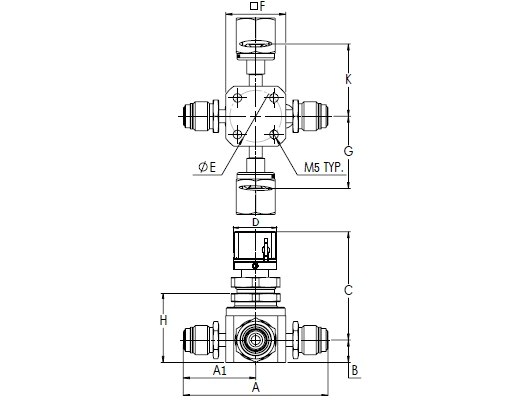 HM Series, Low Pressure UHP Manual 4 Port Valve, Swivel Male 1/4” x Swivel Female 1/4” x Swivel Male 1/4” x Swivel Female 1/4”