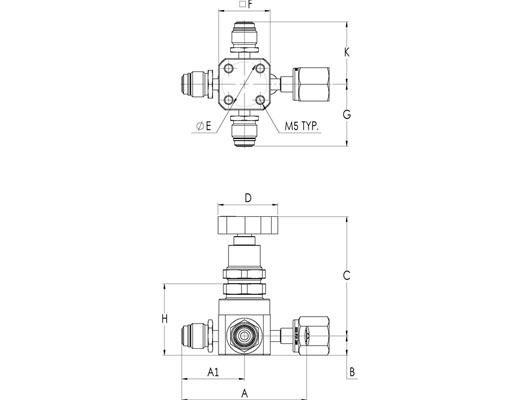 HM414VKLQGM4GM4GF4GM4, HM Series, Low Pressure UHP Manual 4 Port Valve, Swivel Male 1/4” x Swivel Male 1/4” x Swivel Female 1/4” x Swivel Male 1/4”