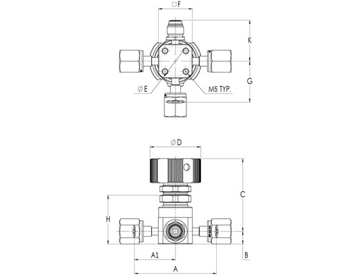 HM414VKLRGF4GF4GF4GM4, HM Series, Low Pressure UHP Manual 4 Port Valve, Swivel Female 1/4” x Swivel Female 1/4” x Swivel Female 1/4” x Swivel Male 1/4”