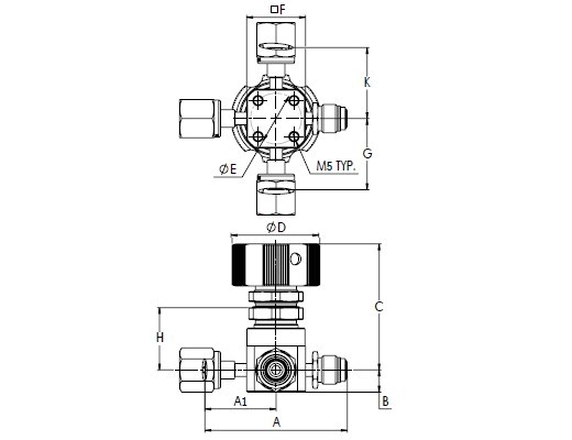 HM414VKLRGF4GF4GM4GF4, HM Series, Low Pressure UHP Manual 4 Port Valve, Swivel Female 1/4” x Swivel Female 1/4” x Swivel Male 1/4” x Swivel Female 1/4”