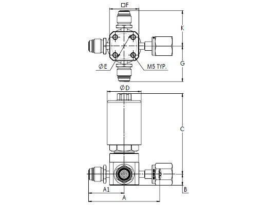 HM Series, Low Pressure UHP Actuated 4 Port Valve, Swivel Male 1/4” x Swivel Male 1/4” x Swivel Female 1/4” x Swivel Male 1/4”