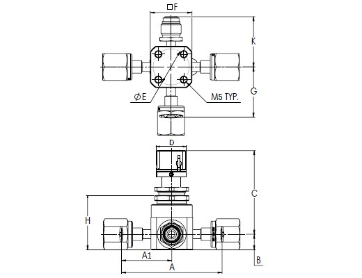 HM424VKLQGF4GF4GF4GM4ISLT, HM Series, Low Pressure UHP Manual 4 Port Valve, Swivel Female 1/4” x Swivel Female 1/4” x Swivel Female 1/4” x Swivel Male 1/4”