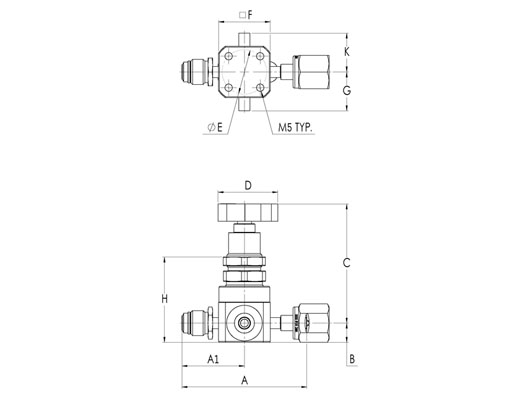 HM Series, Low Pressure UHP Manual 4 Port Valve, Swivel Male 1/4” x Short Buttweld 1/4” x Swivel Female 1/4” x Short Buttweld 1/4”