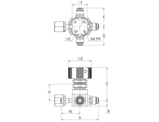 HM424VKLRGF4GM4GM4GM4, HM Series, Low Pressure UHP Manual 4 Port Valve, Swivel Female 1/4” x Swivel Male 1/4” x Swivel Male 1/4” x Swivel Male 1/4”